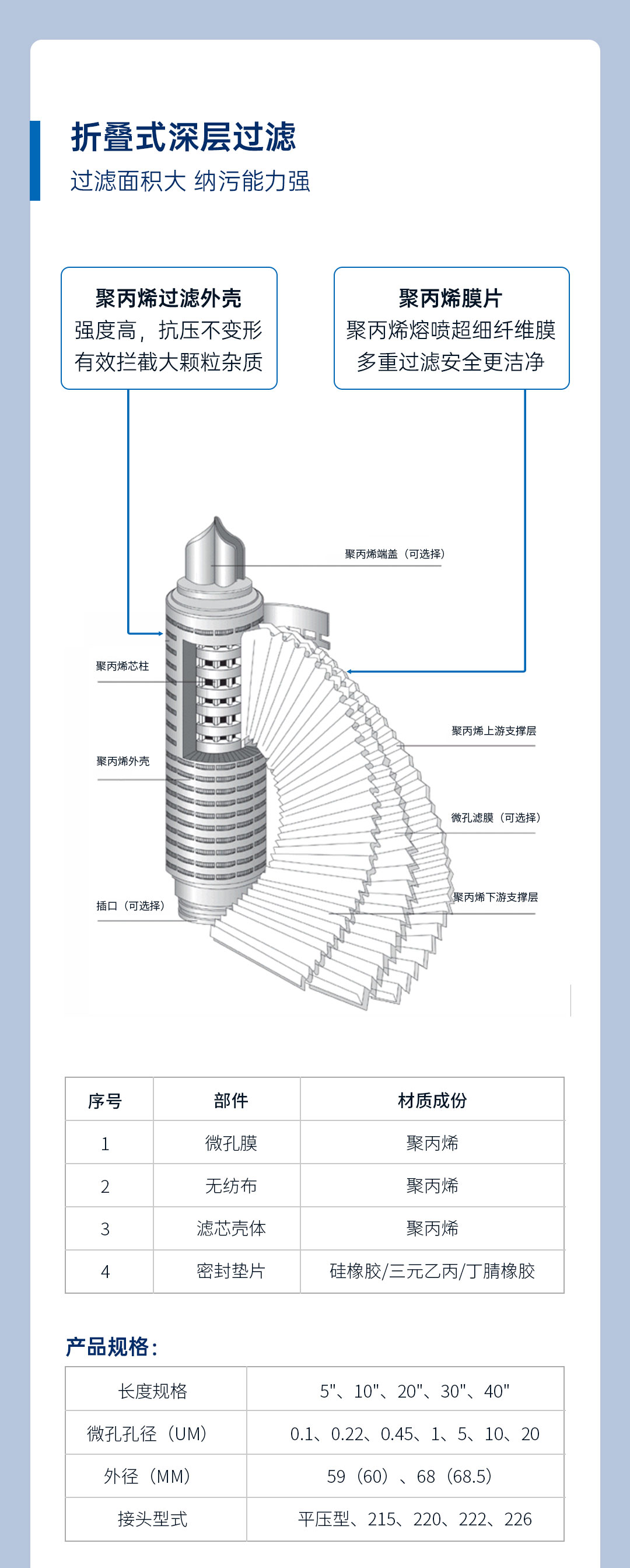 作為高過濾精度濾芯的折疊濾芯,在材質(zhì)上主要精選聚丙烯(PP)高分子微孔過濾膜材料,耐酸耐堿等化學(xué)相容性好;在生產(chǎn)工藝上,采用獨(dú)特的熱熔焊接加工技術(shù),采用100%全新PP注塑成型塑料殼體,無任何粘合劑,無異物釋出。