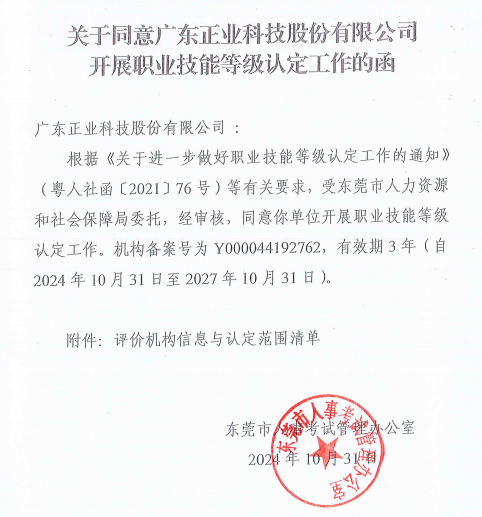 近日,廣東正業(yè)科技股份有限公司(以下簡稱:正業(yè)科技)收到了東莞市人事考試管理辦公室“關于同意廣東正業(yè)科技股份有限公司開展職業(yè)技能等級認定工作的函”。這標志著公司順利完成了職業(yè)技能等級認定備案工作,開啟了公司技能人才隊伍培養(yǎng)與認定的新篇章。