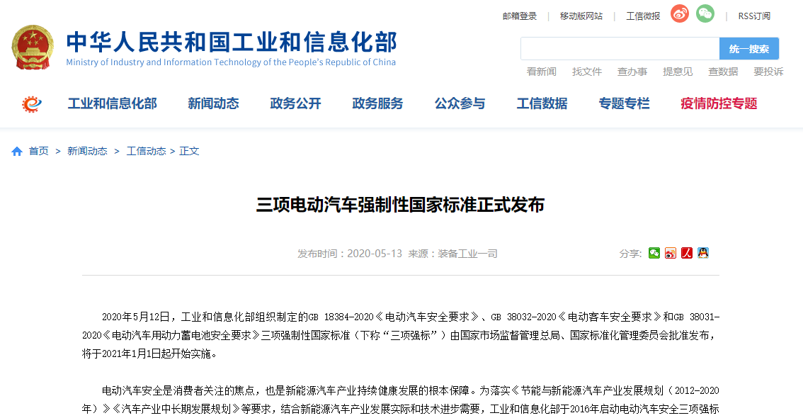 2020年5月12日,工業(yè)和信息化部組織制定的GB 18384-2020《電動(dòng)汽車安全要求》、GB 38032-2020《電動(dòng)客車安全要求》和GB 38031-2020《電動(dòng)汽車用動(dòng)力蓄電池安全要求》三項(xiàng)強(qiáng)制性國(guó)家標(biāo)準(zhǔn)由國(guó)家市場(chǎng)監(jiān)督管理總局、國(guó)家標(biāo)準(zhǔn)化管理委員會(huì)批準(zhǔn)發(fā)布,進(jìn)一步提高和優(yōu)化了對(duì)電動(dòng)汽車整車和動(dòng)力電池產(chǎn)品的安全技術(shù)要求。