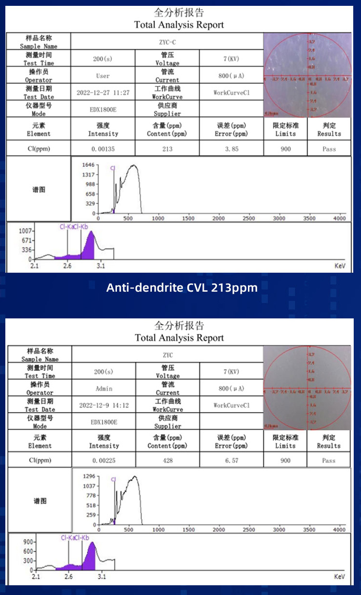 Anti-dendrite產品具有較Normal產品更低的鹵素水準,更耐離子遷移。
