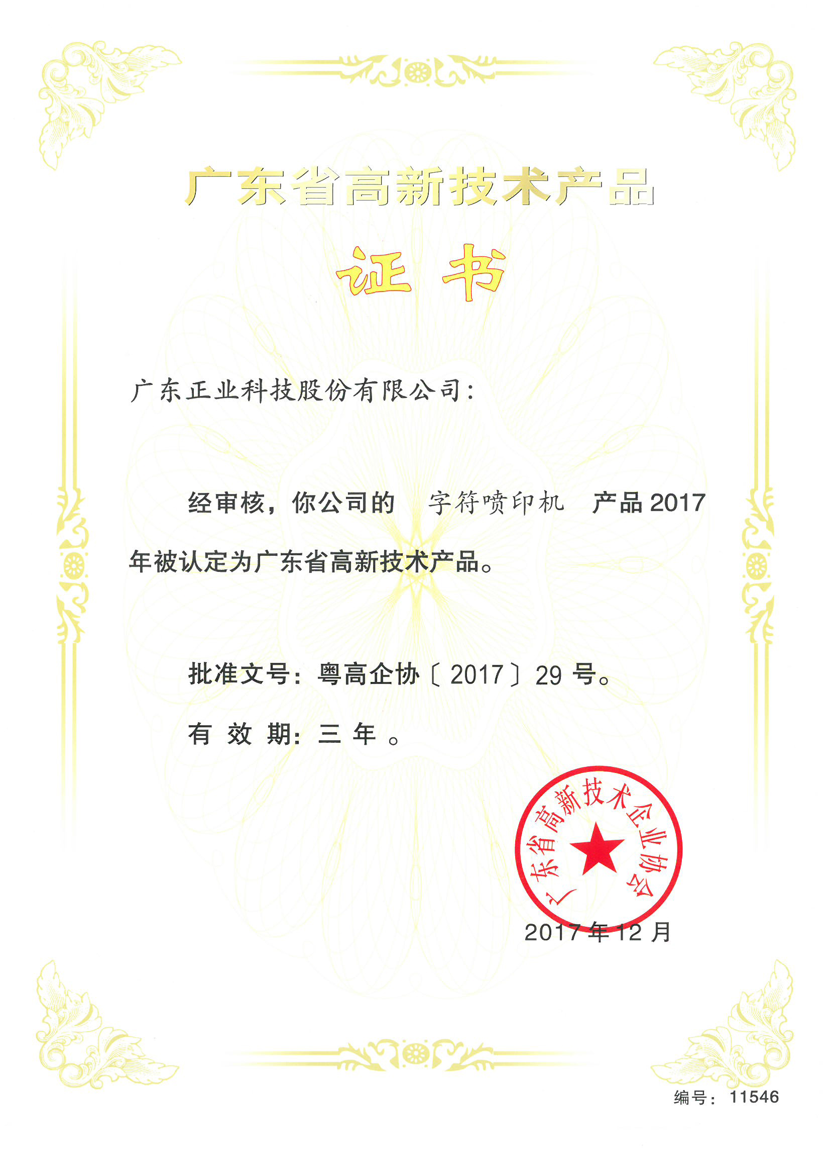 正業(yè)科技字符噴印機榮獲廣東省高新技術(shù)產(chǎn)品認證